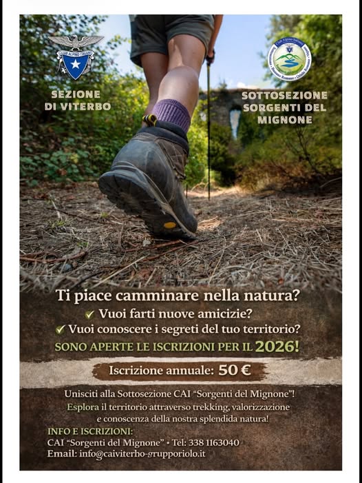Il Comune di Vejano informa la cittadinanza che sono aperte le iscrizioni per l’anno 2026 al Club Alpino Italiano – Sottosezione “Sorgenti del Mignone”.