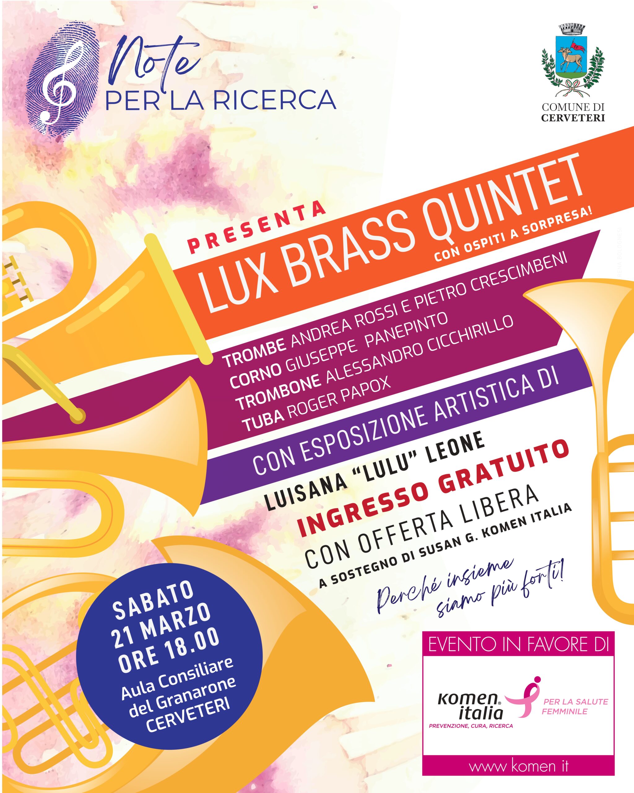 “Uno straordinario quintetto di musicisti a sostegno di Komen Italia, una delle realtà italiane e mondiali da sempre in prima linea nella prevenzione del tumore al seno. Torna ‘Note per la Ricerca’, la rassegna che coniuga musica, arte e spettacolo in favore della Ricerca Scientifica e della prevenzione. Ad esibirsi, il Lux Brass Quintet, straordinario quintetto di ottoni, con Andrea Rossi e Pietro Crescimbeni alle trombe, Giuseppe Panepinto al corno, Alessandro Cicchirillo al trombone e Roger Papox alla Tuba. Non mancheranno chiaramente anche tanti ospiti a sorpresa. A far da cornice, l’esposizione di opere di Luisana ‘Lulù’ Leone, amica e artista di spessore, pronta a rendere ancor più magica l’atmosfera con installazioni e quadri. Sarà un pomeriggio di spettacolo, amicizia, solidarietà e sensibilizzazione, pensato per tutta la città e dedicato a tutte le Donne guerriere”.
