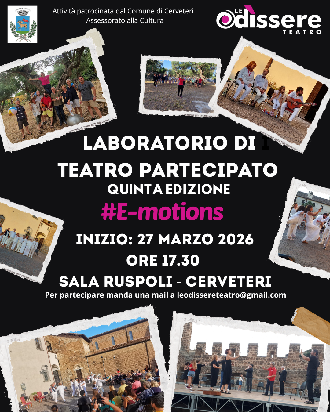 Il percorso formativo, previsto dal 27 marzo 2026 a agosto 2026, sarà condotto da Odette Piscitelli (attrice, formatrice, direttrice artistica di Le Odìssere Teatro) e da Gianluca Enria  (attore – regista e pedagogo teatrale) e coinvolgerà cittadine e cittadini, studentesse e studenti, senza limiti di età e/o formazione residenti nel territorio di Cerveteri, Ladispoli e comuni limitrofi.