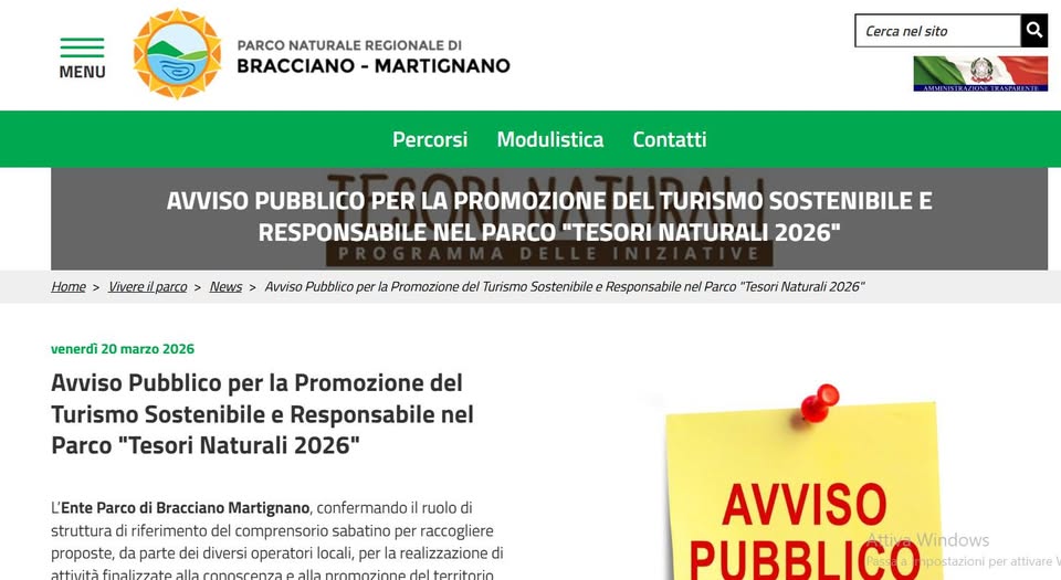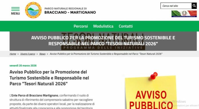 L’Ente Parco di Bracciano Martignano, confermando il ruolo di struttura di riferimento del comprensorio sabatino per raccogliere proposte, da parte dei diversi operatori locali, per la realizzazione di attività finalizzate alla conoscenza e alla promozione del territorio protetto, propone per l’anno 2026 il bando per la Promozione del Turismo sostenibile e responsabile “Tesori Naturali 2026” finalizzato alla realizzazione di un calendario di attività articolate indicativamente una nei giorni festivi e una nei prefestivi, fermo restando le attività seriali proposte periodicamente ed in concomitanza delle giornate tematiche mondiali e/o nazionali organizzate direttamente dall’Ente.