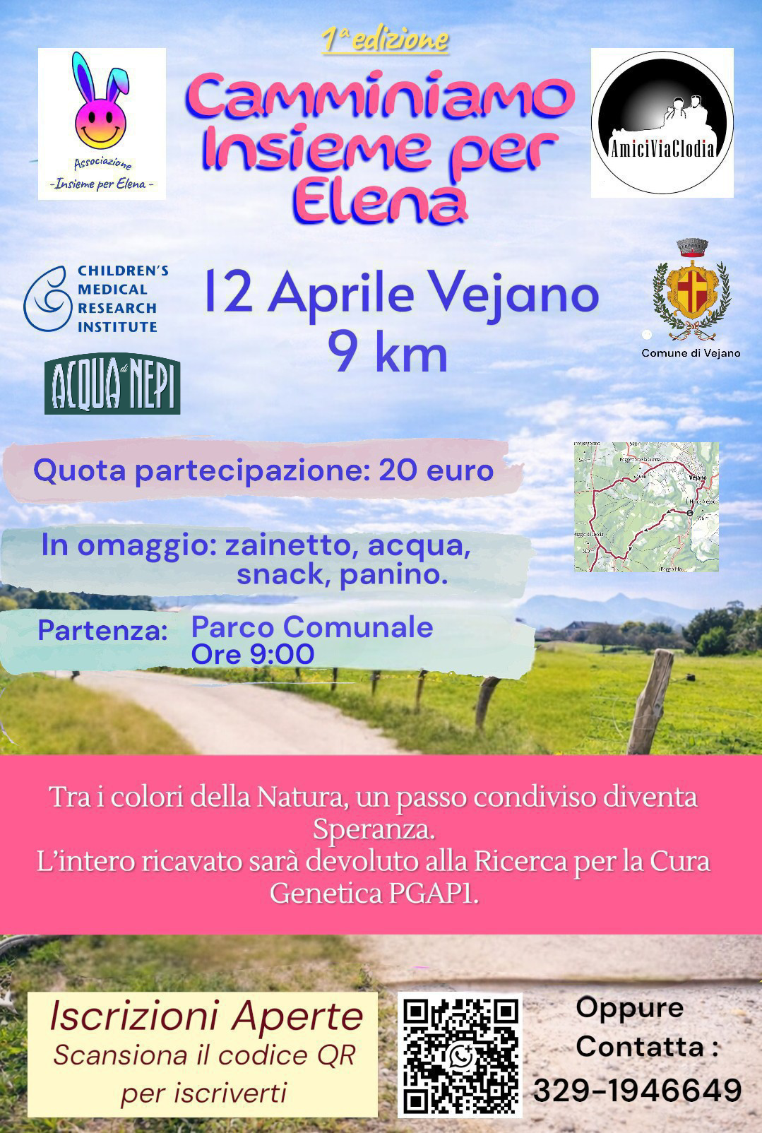 Il prossimo 12 aprile, il Comune di Vejano ospiterà una camminata solidale di circa 9 km, intitolata “Camminiamo insieme per Elena”, promossa dall’Associazione Insieme per Elena in collaborazione con gli Amici della via Clodia.