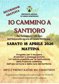 HomeEventi “Io cammino a Santioro” escursione gratuita organizzata per i 120 anni dell’Università Agraria di Canale 27/03/2026 0 82 E-mailTwitterWhatsAppFacebookPinterestLinkedinReddItTumblrTelegramViberStampa Comunicato stampa Tags120 anniagrariacamminoCanalefesteggiareprogrammaSantiorouniversità Condividere E-mailTwitterWhatsAppFacebookPinterestLinkedinReddItTumblrTelegramViberStampa Articolo precedenteLIONS CLUB BRACCIANO ANGUILLARA MONTI SABATINI- UN POSTER PER LA PACE – PREMIATI GLI STUDENTI DI ORIOLO E BASSANO ROMANO Articolo successivoInaugurazione cinema Freccia a Ladispoli Ultimi articoli Eventi A CIVITAVECCHIA, TERME IN FIORE XVII EDIZIONE – 28 e 29 MARZO 2026 Cultura Domenica 29 marzo 2026 Concerto Lirico al Consorzio Lago Bracciano Cultura “La buona novella” al teatro Charles De Focauld di Bracciano Scuola IL FUTURO E’ DOLCE. ALL’ALBERGHIERO DI LADISPOLI UNA GIORNATA DI FORMAZIONE DEDICATA ALLA PASTICCERIA CON LO CHEF GABRIELE LUCCERINI Società Inaugurazione cinema Freccia a Ladispoli Carica altri
