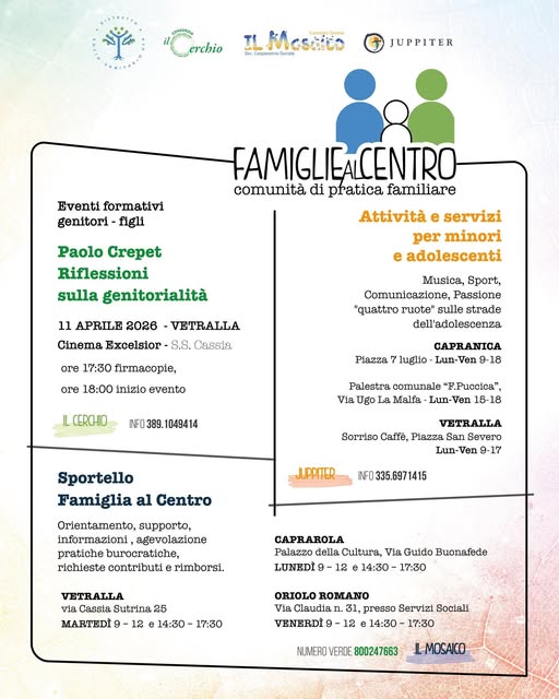 Nell’ambito del progetto sono inoltre previsti incontri ad ingresso gratuito dedicati alla genitorialità e alle relazioni, che si svolgeranno nei diversi Comuni appartenenti al Distretto VT4, offrendo occasioni di confronto e approfondimento aperte a tutta la cittadinanza.