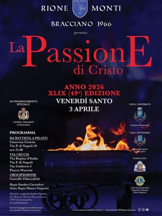Venerdì 3 aprile a Bracciano torna uno degli appuntamenti più attesi e suggestivi della nostra comunità: la “Passione di Cristo”, la storica rievocazione organizzata dal Rione Monti con il contributo e il patrocinio del Comune di Bracciano.