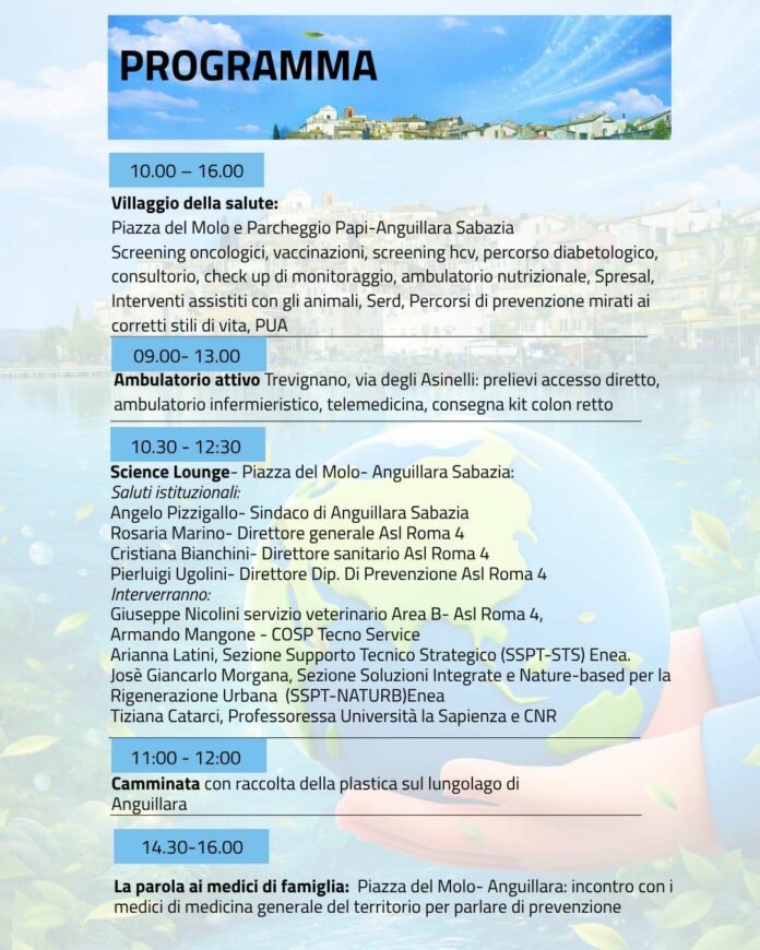 La raccolta dei tappi proseguirà anche sabato, in occasione dell’evento principale, quando il molo di Anguillara si trasformerà nel “Villaggio della Prevenzione”. Qui la Asl Roma 4 allestirà numerosi stand informativi e di servizio: i cittadini potranno accedere gratuitamente a screening sanitari, consulti nutrizionali e ricevere indicazioni su sicurezza e corretti stili di vita in ambito domestico e lavorativo.