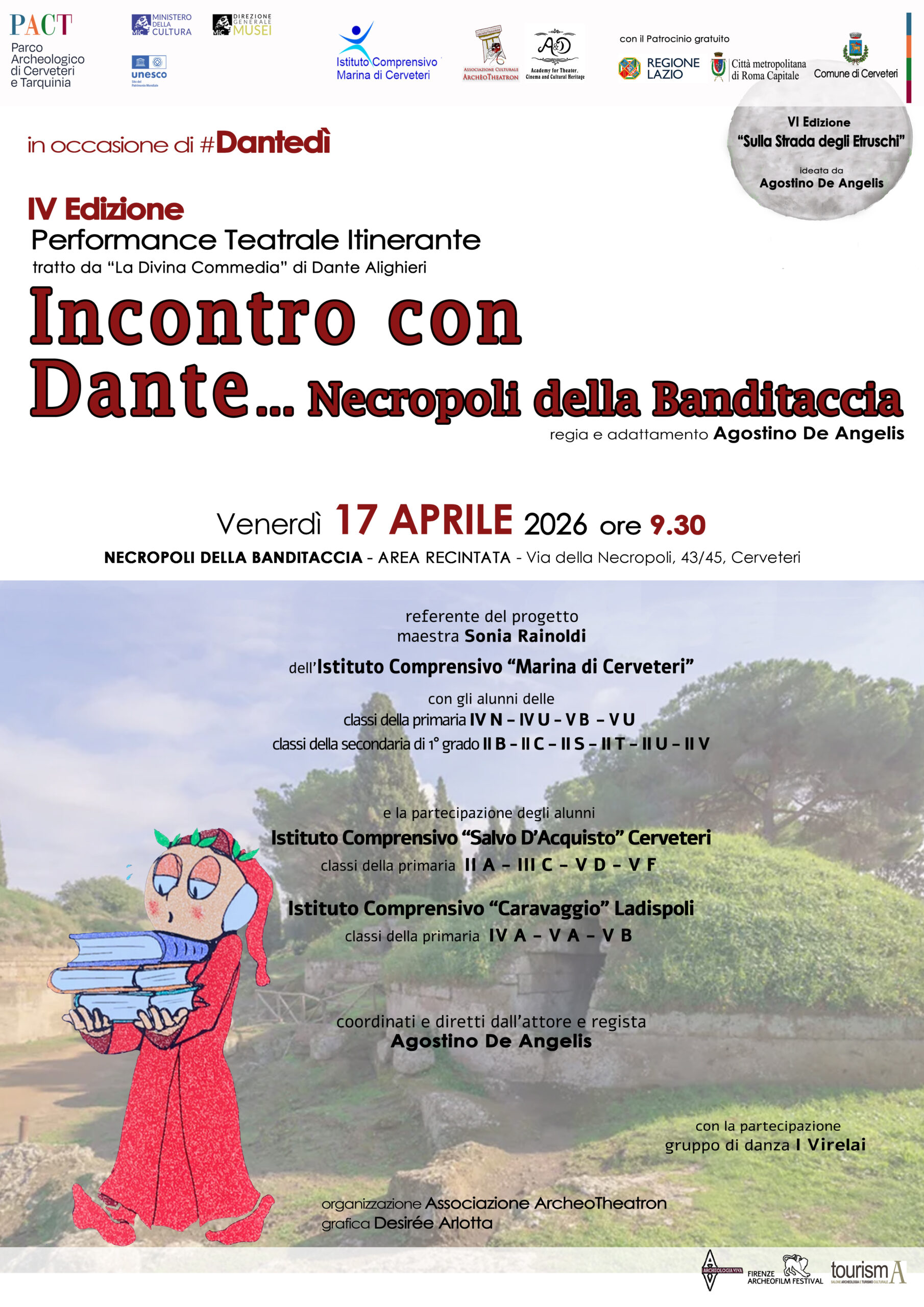 Il prossimo 17 aprile dalle ore 9.00 alle 13.00 nella Necropoli della Banditaccia, sito Unesco di Cerveteri, si svolgerà la IV Edizione del Dantedì. L’appuntamento, come avvenuto gli scorsi anni, è ideato dalla maestra Sonia Rainoldi, referente dell’IC Marina di Cerveteri grazie al supporto del Dirigente Angela Esposito con l’organizzazione dell’Associazione Culturale ArcheoTheatron e il Parco Archeologico Cerveteri-Tarquinia nella persona del Direttore Vincenzo Bellelli, che ha concesso il sito per lo svolgimento della manifestazione.