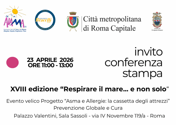 Si svolgerà giovedì 23 aprile dalle 11.00, presso la Sala David Sassoli di Palazzo Valentini, la conferenza stampa di presentazione dell’evento “Respirare il mare…e non solo”, una giornata dedicata alle uscite in barca a vela per bambini e adulti per la sensibilizzazione sulle malattie allergiche e respiratorie. L’evento, giunto quest’anno alla XVIII edizione è collegato al progetto rivolto alle scuole “Asma e Allergie: la cassetta degli attrezzi”.
