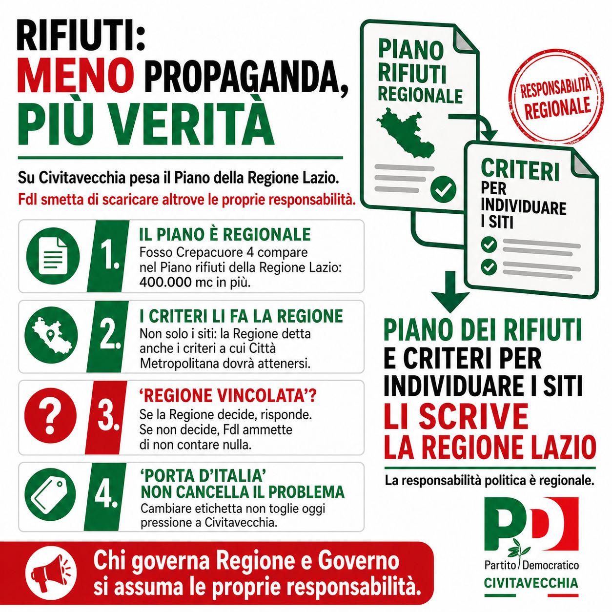 Fratelli d’Italia Civitavecchia non ha smentito il dato politico essenziale: lo ha confermato. Nel nuovo Piano regionale dei rifiuti Civitavecchia compare tra i siti principali dell’ATO 1, con l’ampliamento in autorizzazione di Fosso Crepacuore 4 per 400.000 metri cubi. E quel Piano non lo firma il Partito Democratico: lo presenta la Regione Lazio guidata dal centrodestra.