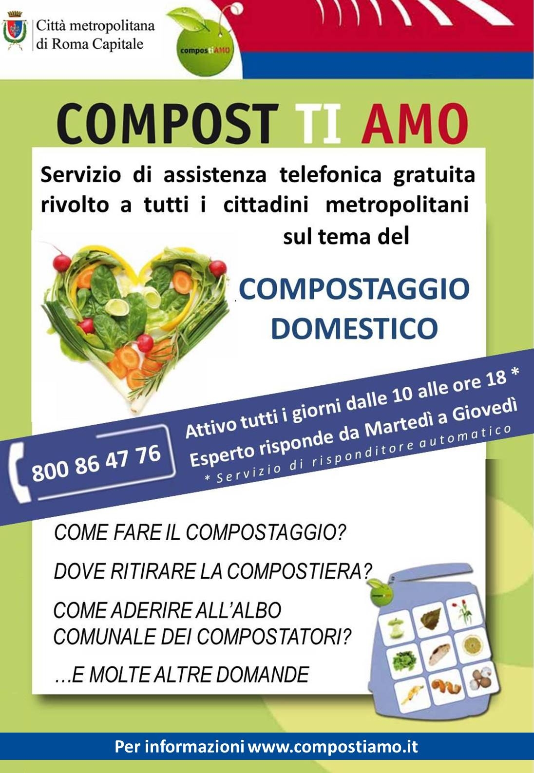 Si comunica che la Città Metropolitana di Roma Capitale, ha attivato un servizio gratuito di assistenza telefonica rivolto ai cittadini metropolitani, utenti del Compostaggio Domestico. Il servizio è attivo tutti i giorni dalle ore 10:00 alle ore 18:00